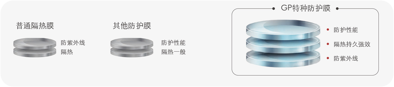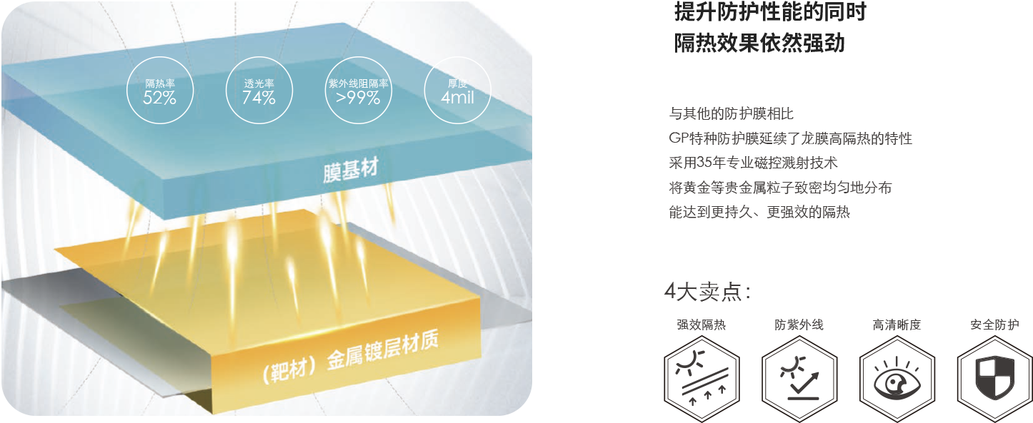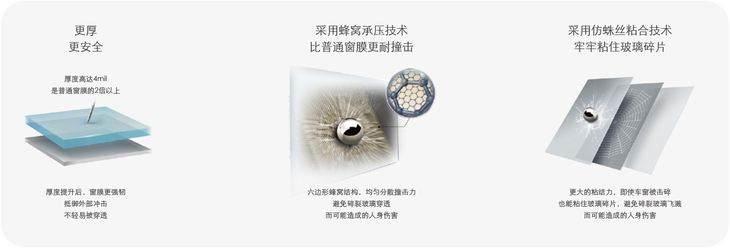 除了具备普通隔热膜的防紫外线和隔热性能外,防护膜通过特殊工艺制成,更增加了防护性能。