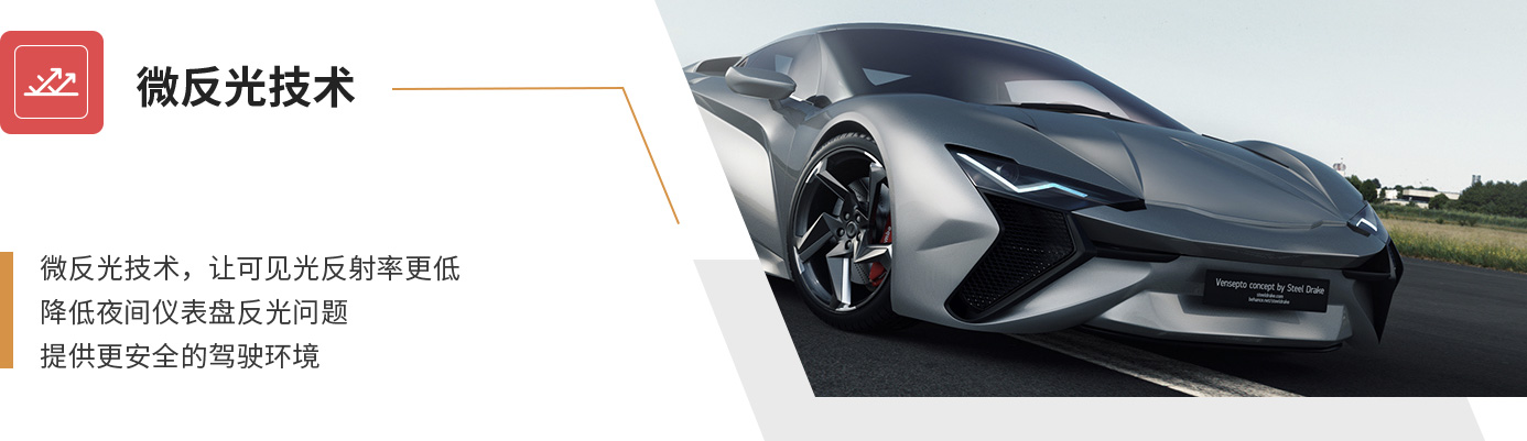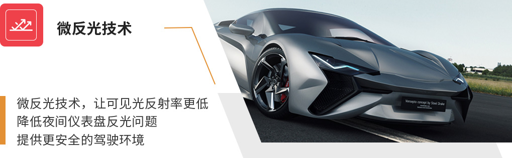 • 微反光技术,让可见光反射率更低,降低夜间仪表盘反光问题,提供更安全的驾驶环境